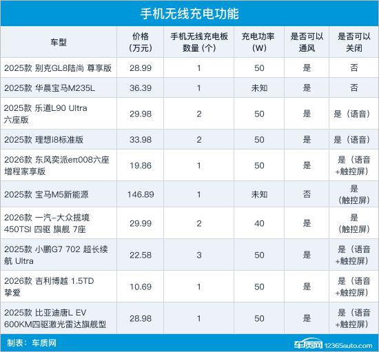 通過對10款車型手機無線充電功能對比發(fā)現(xiàn),小鵬G7配備3個無線充電板,2個在前排,1個在后排,方便前后排用戶使用;樂道L90、理想i8和一汽 - 大眾攬境均配備2個無線充電板,且前排無線充電板有通風散熱功能。此外,除別克GL8陸尚和華晨寶馬M235L,其余8款車型的手機無線充電功能支持關(guān)閉,東風奕派e π 008、小鵬G7、吉利博越和比亞迪唐L EV還支持兩種關(guān)閉方式,實用性較高。