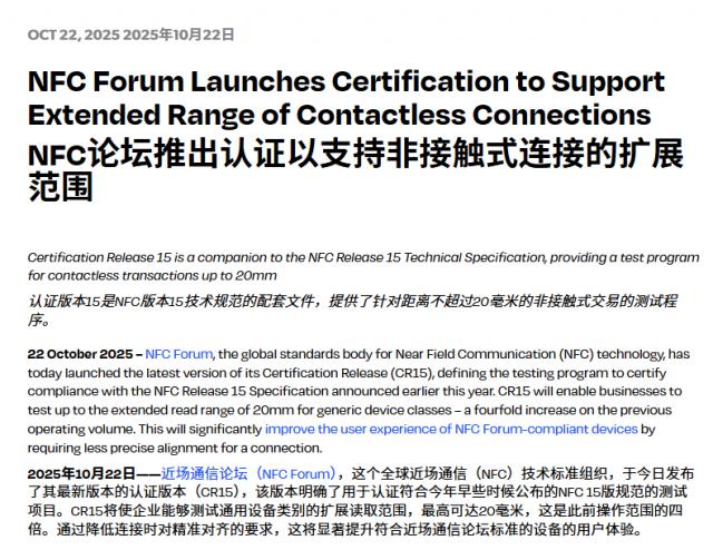 IT之家10月23日消息,近場(chǎng)通信論壇(NFC Forum)今日宣布推出NFC認(rèn)證版本15(Certification Release 15,簡(jiǎn)稱(chēng)CR15),該版本有一項(xiàng)重要更新,極大提升了NFC設(shè)備的潛在讀取距離。CR15明確了針對(duì)今年早些時(shí)候發(fā)布的NFC版本15技術(shù)規(guī)范的合規(guī)性認(rèn)證計(jì)劃。