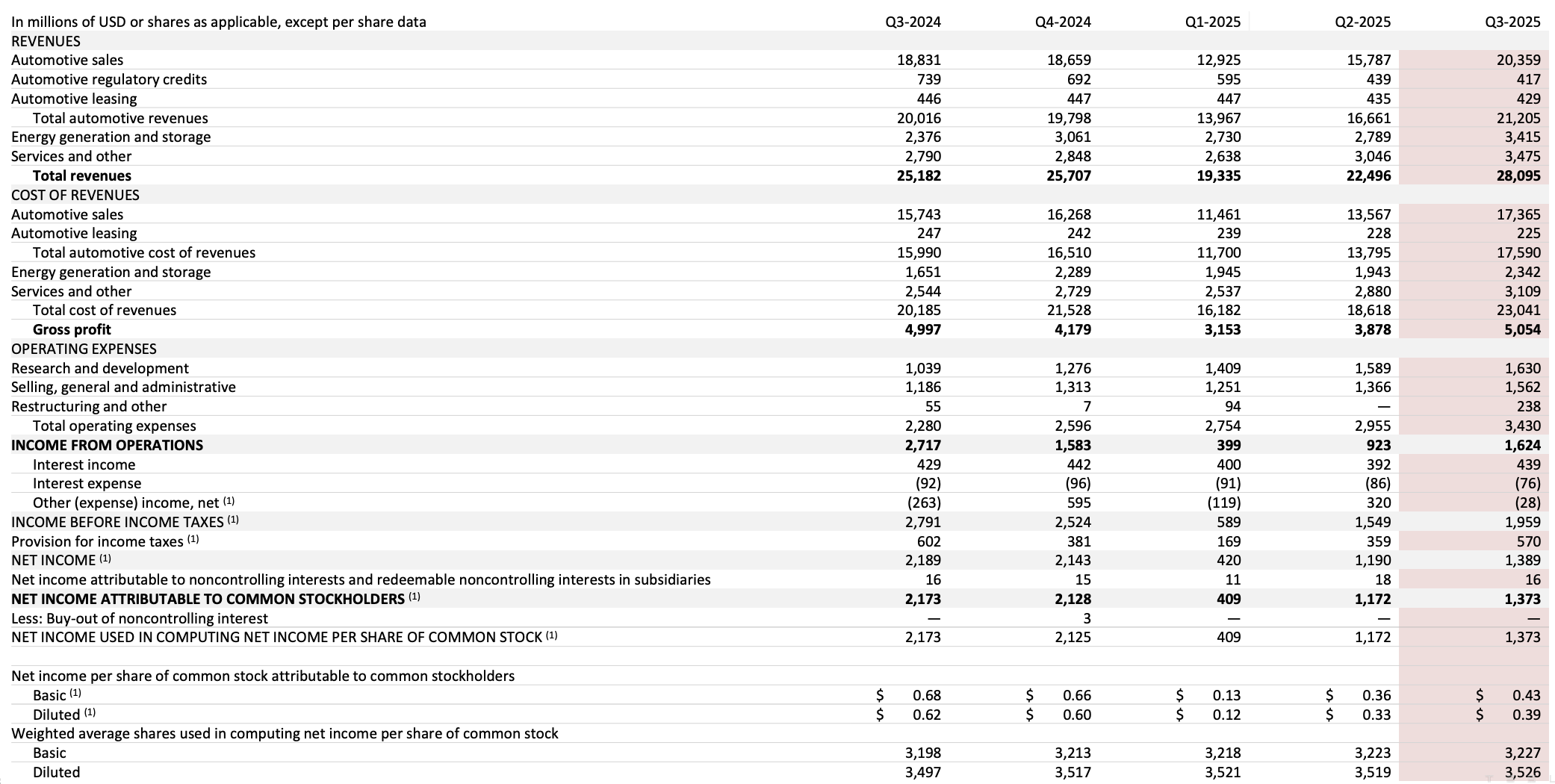 北京時(shí)間10月23日,特斯拉公布的2025年第三季度業(yè)績顯示,該公司第三季度營收達(dá)到280.95億美元,創(chuàng)造了季度營收的新紀(jì)錄,同比增長11.57%,超出了華爾街的預(yù)期。