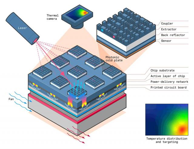 將一系列一平方毫米的光子冷板平鋪在芯片基板頂部,用外部熱像儀感應(yīng)芯片熱點。熱點出現(xiàn)時,激光照射旁邊的光子冷板,刺激光子過程提取熱量,實現(xiàn)降溫。