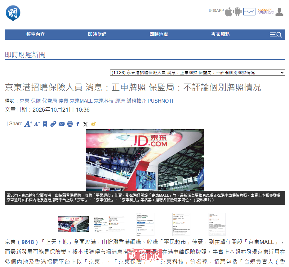 此外,據(jù)香港本地媒體消息,京東準備進軍香港保險業(yè),正在申請保險牌照。近期,京東在多個招聘平臺招聘保險相關(guān)職位,或建立自家保險團隊。京東暫無回應(yīng),香港保監(jiān)局稱不評論個別牌照情況。