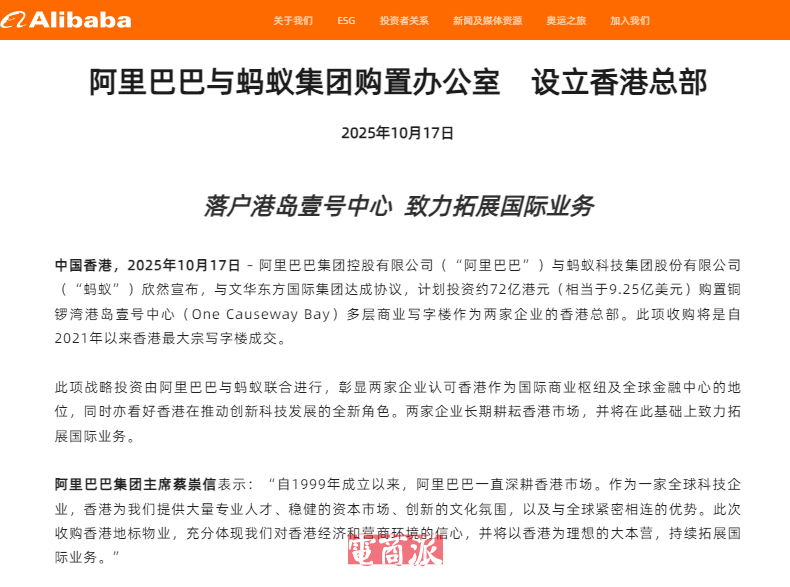 對此,阿里巴巴集團主席蔡崇信表示,自1999年成立以來,阿里巴巴就深耕香港市場。收購香港地標物業(yè)后,將以香港為理想大本營,持續(xù)拓展國際業(yè)務(wù)。