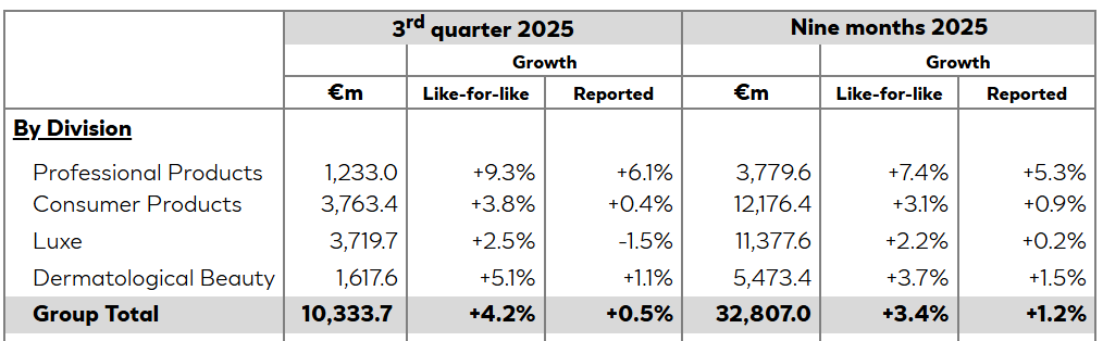 財(cái)報(bào)顯示,截至2025年9月30日止的三個(gè)季度內(nèi),歐萊雅集團(tuán)銷(xiāo)售額為328.0億歐元(約合人民幣2709.62億元),同比增長(zhǎng)3.4%。其中,第三季度錄得銷(xiāo)售額為103.37億歐元(約合人民幣853.94億元),較上年同期增長(zhǎng)4.2%。