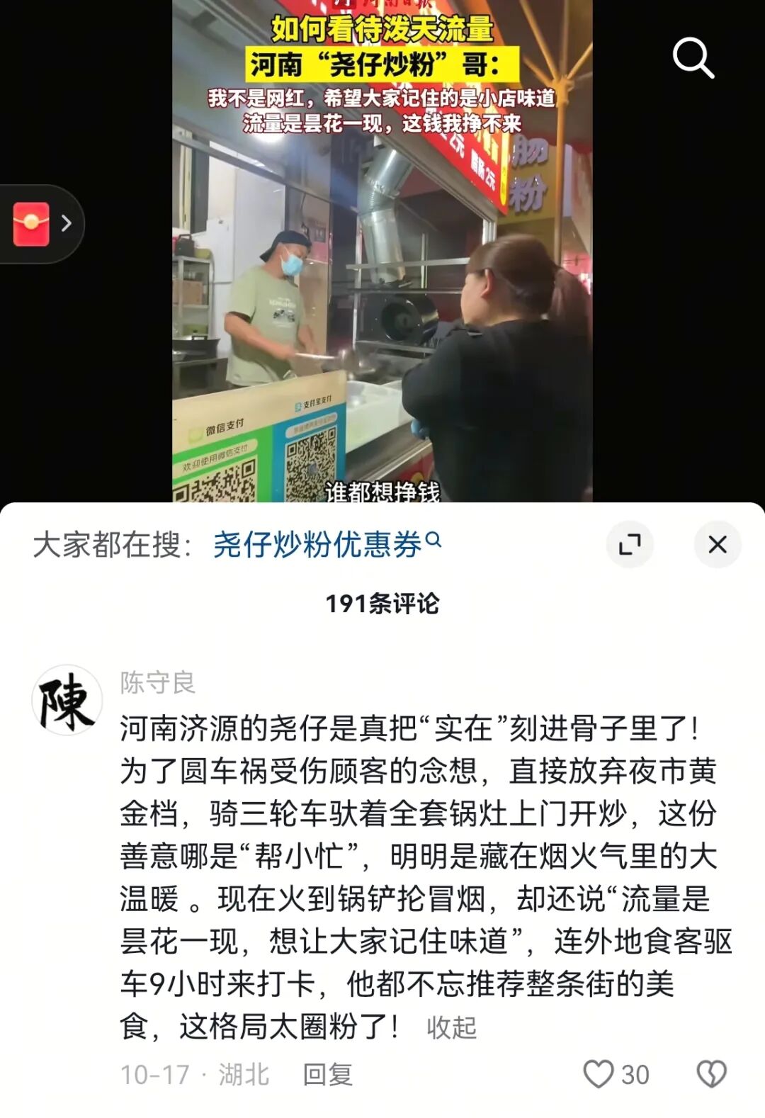在河南濟(jì)源的御駕小吃街,“堯仔炒粉”的周老板一次出于本心的善意選擇,讓他的生活發(fā)生了巨變。9月,知名博主“發(fā)癲吧,后浪!”為了滿足車禍出院好友的心愿,請求老板上門為好友制作一碗心心念念的炒粉。