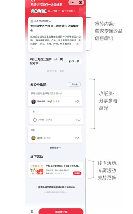 邀請商戶加入“小紅花好事地圖”,將善意常態(tài)化,個體善行連成社區(qū)風(fēng)景,讓付出得到認(rèn)可,打造有溫度的友好商圈。