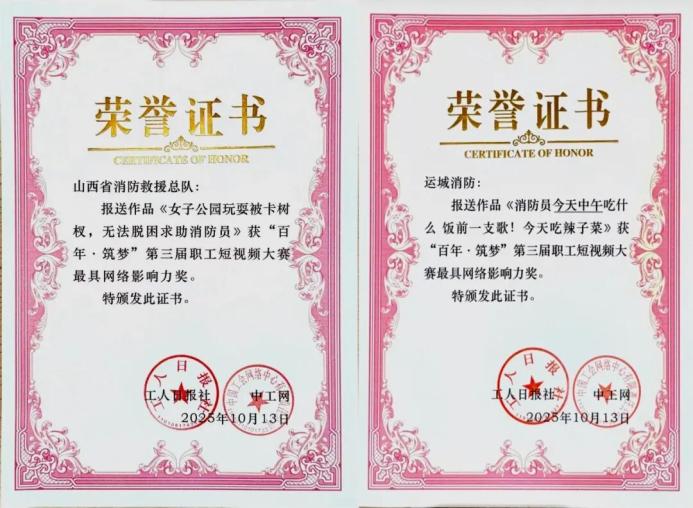 近日,在中華全國總工會(huì)宣傳教育部、網(wǎng)絡(luò)工作部指導(dǎo),工人日?qǐng)?bào)社、中工網(wǎng)聯(lián)合主辦,河北省邯鄲市總工會(huì)承辦的“百年·筑夢(mèng)”第三屆職工短視頻大賽分享交流暨頒獎(jiǎng)活動(dòng)中,山西消防選送的兩部抖音作品《消防員今天中午吃什么 飯前一支歌!今天吃辣子菜》和《女子公園玩耍被卡樹杈,無法脫困求助消防員》,憑借獨(dú)特視角與廣泛網(wǎng)絡(luò)影響力,從全國報(bào)送的1692件參賽作品中脫穎而出,榮獲大賽“最具網(wǎng)絡(luò)影響力獎(jiǎng)(抖音端)”。