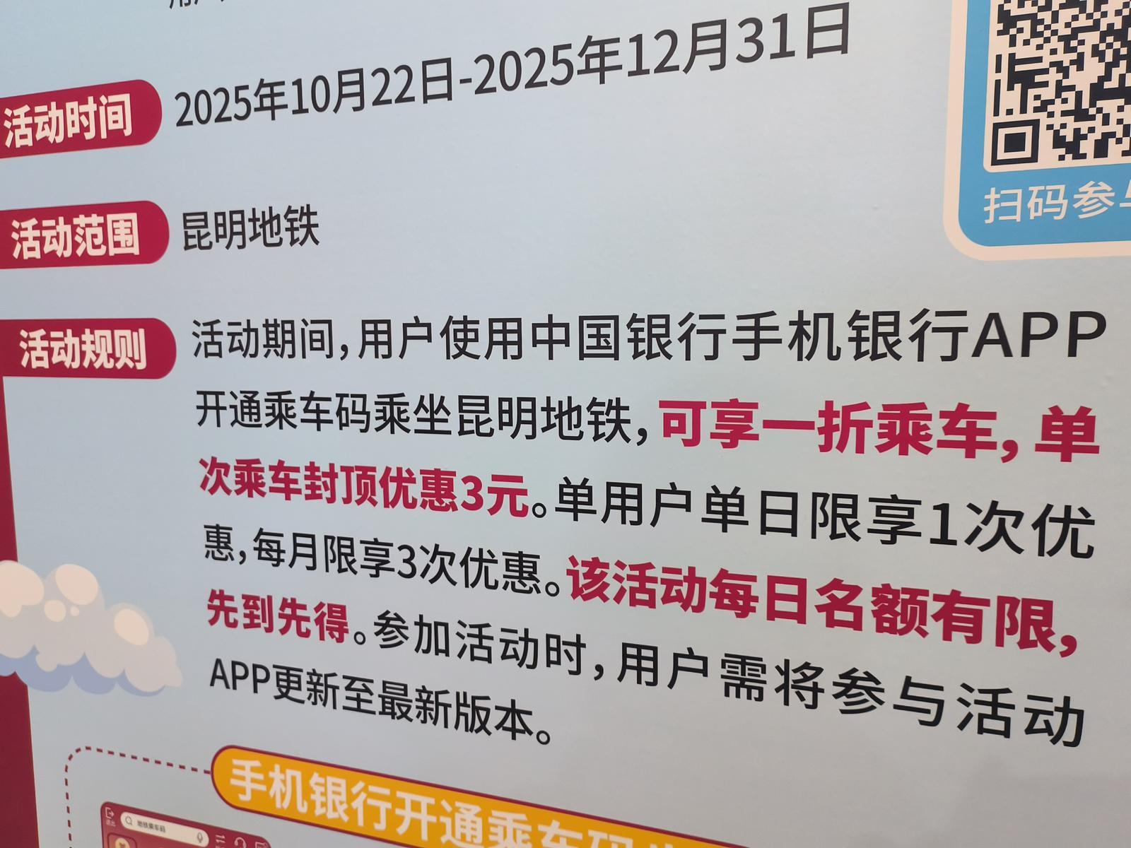 活動期間,昆明地鐵線網(wǎng)的所有線路都參與此次活動。乘客只需開通中國銀行手機銀行App,并綁定中國銀行62開頭銀聯(lián)借記卡,將定位設置在云南省昆明市,使用中國銀行手機銀行App開通乘車碼乘坐昆明地鐵,即可享受1折乘車優(yōu)惠。乘客掃碼出站后,系統(tǒng)會自動按照優(yōu)惠金額扣費。不過,本活動單次乘車封頂優(yōu)惠3元,單用戶單日限享1次優(yōu)惠,每月限享3次優(yōu)惠,且每日名額有限,先到先得。