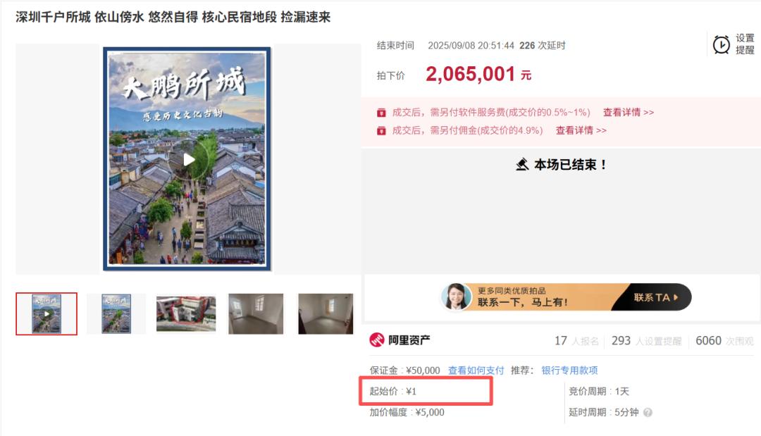 比如深圳大鵬新區(qū)的千戶所城獨棟住宅,建筑面積290平方米,實際使用面積約320平方米,經(jīng)過267次競拍后以206.5萬元成交。而當(dāng)前大鵬新區(qū)二手房月均交易量不足10套。