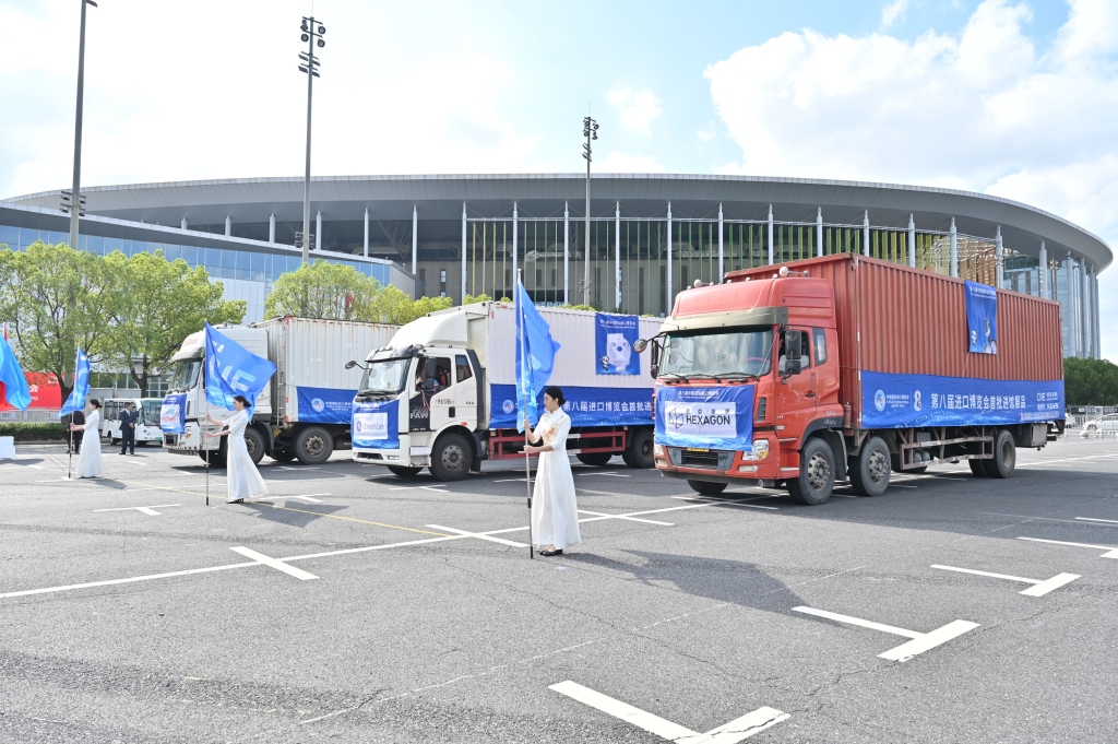 裝載著進博會首批展品的物流運輸車緩緩駛?cè)搿八娜~草”北廣場。