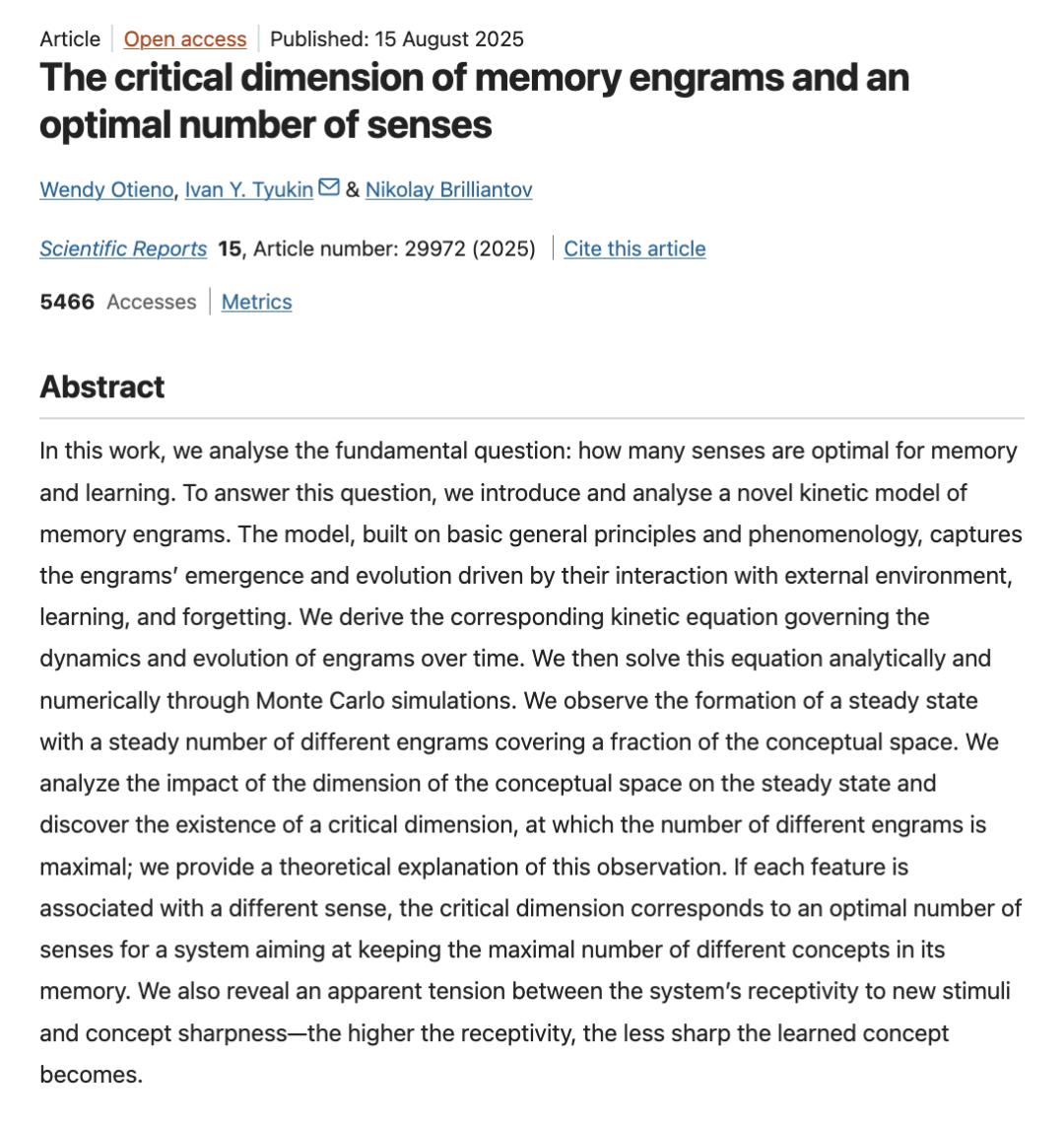 Otieno, W., Tyukin, I.Y. & Brilliantov, N. The critical dimension of memory engrams and an optimal number of senses. Sci Rep 15, 29972 (2025). https://doi.org/10.1038/s41598 - 025 - 11244 - y