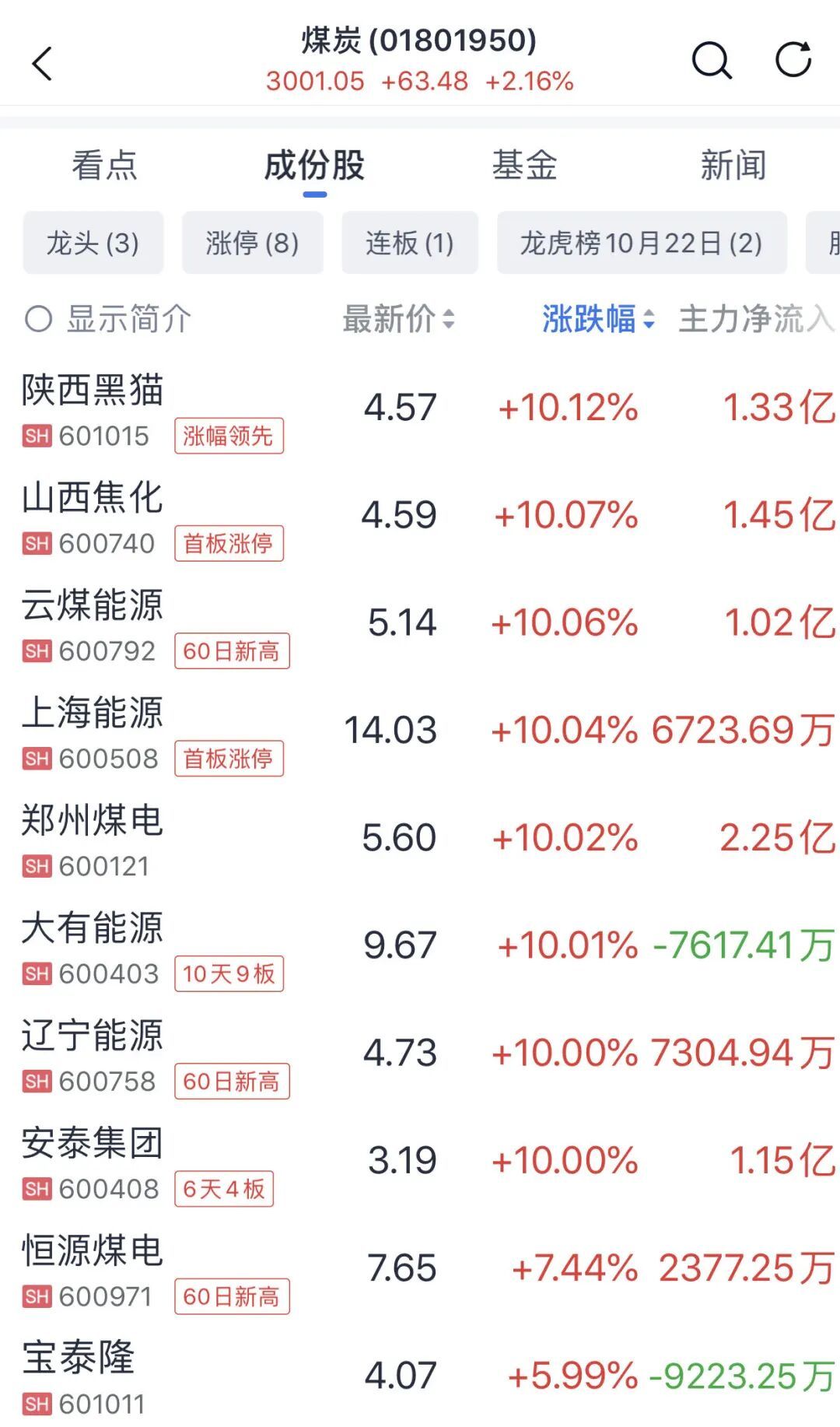 此外,隨著近期全國性降溫以及煤炭價格上行,煤炭板塊股票持續(xù)走強,大有能源、陜西黑貓、云煤能源、上海能源、鄭州煤電等多股漲停。