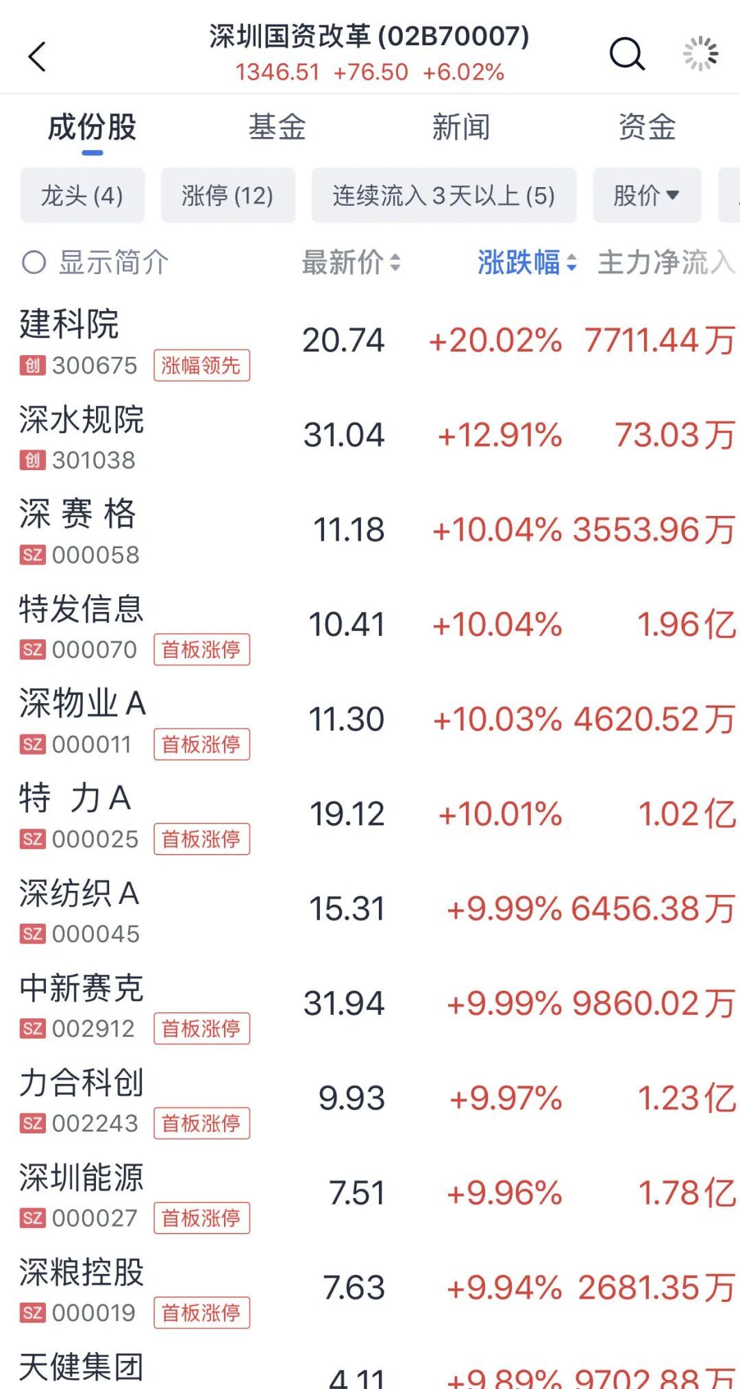 深圳國資概念板塊盤中集體大漲,建科院20%漲停,特發(fā)信息、深賽格、深紡織A、深圳能源、深糧控股、天健集團等多股漲停,還有多股跟漲。
