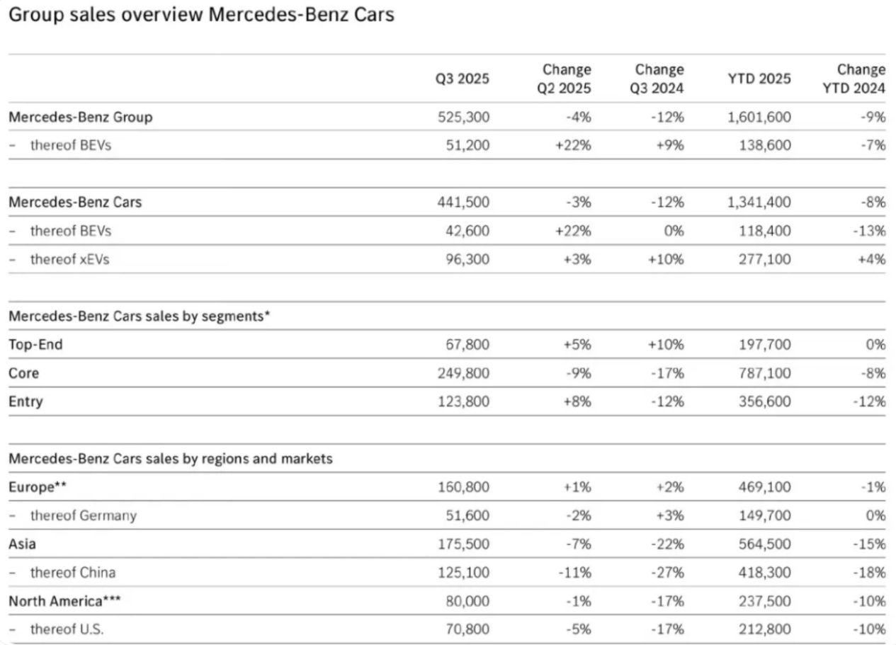 奔馳裁員的背后,是集團(tuán)銷量不佳的現(xiàn)實(shí)。官方數(shù)據(jù)顯示,奔馳集團(tuán)第三季度全球銷量為52.53萬(wàn)輛,同比、環(huán)比分別下滑12%、4%;前三季度累計(jì)銷量為160.16萬(wàn)輛,同比減少9%。