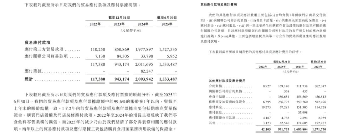 以萬辰集團為例,今年上半年負債總額51.24億元,流動負債43.99億元。其中,“貿易應付款”15.33億元,“其他應付款項”15.72億元。
