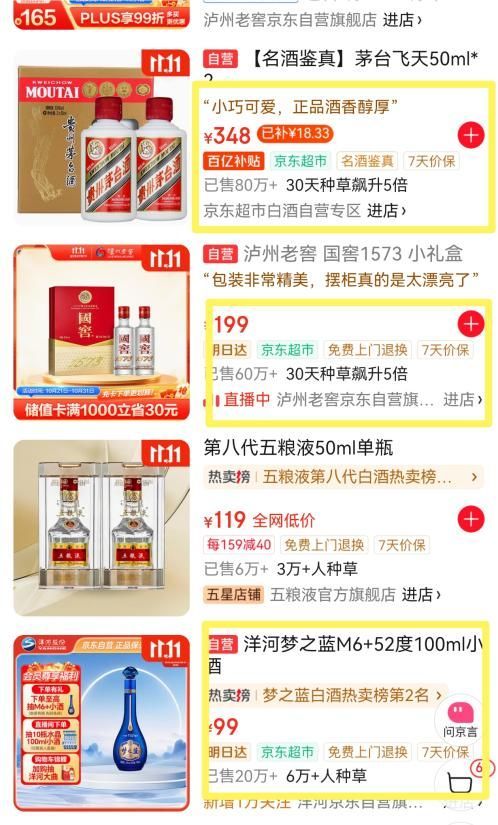 比如在京東平臺(tái)上,50ml茅臺(tái)約150元,50ml五糧液到手價(jià)約132元;在盒馬鮮生的貨架上,50ml的梅見青梅酒售價(jià)9.9元,百利甜酒50ml售價(jià)14.9元;711超市中,125ml的牛小引生椰伏特加19.9元,50ml的蘇格蘭格蘭威士忌25.8元。