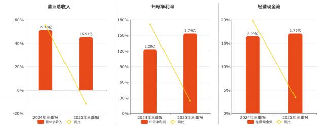 公司營(yíng)業(yè)總收入為16.93億元,相較于去年同報(bào)告期減少了2.25億元,同比下降11.75%。歸屬于母公司股東的凈利潤(rùn)為2.74億元,經(jīng)營(yíng)活動(dòng)現(xiàn)金凈流入為2.75億元。