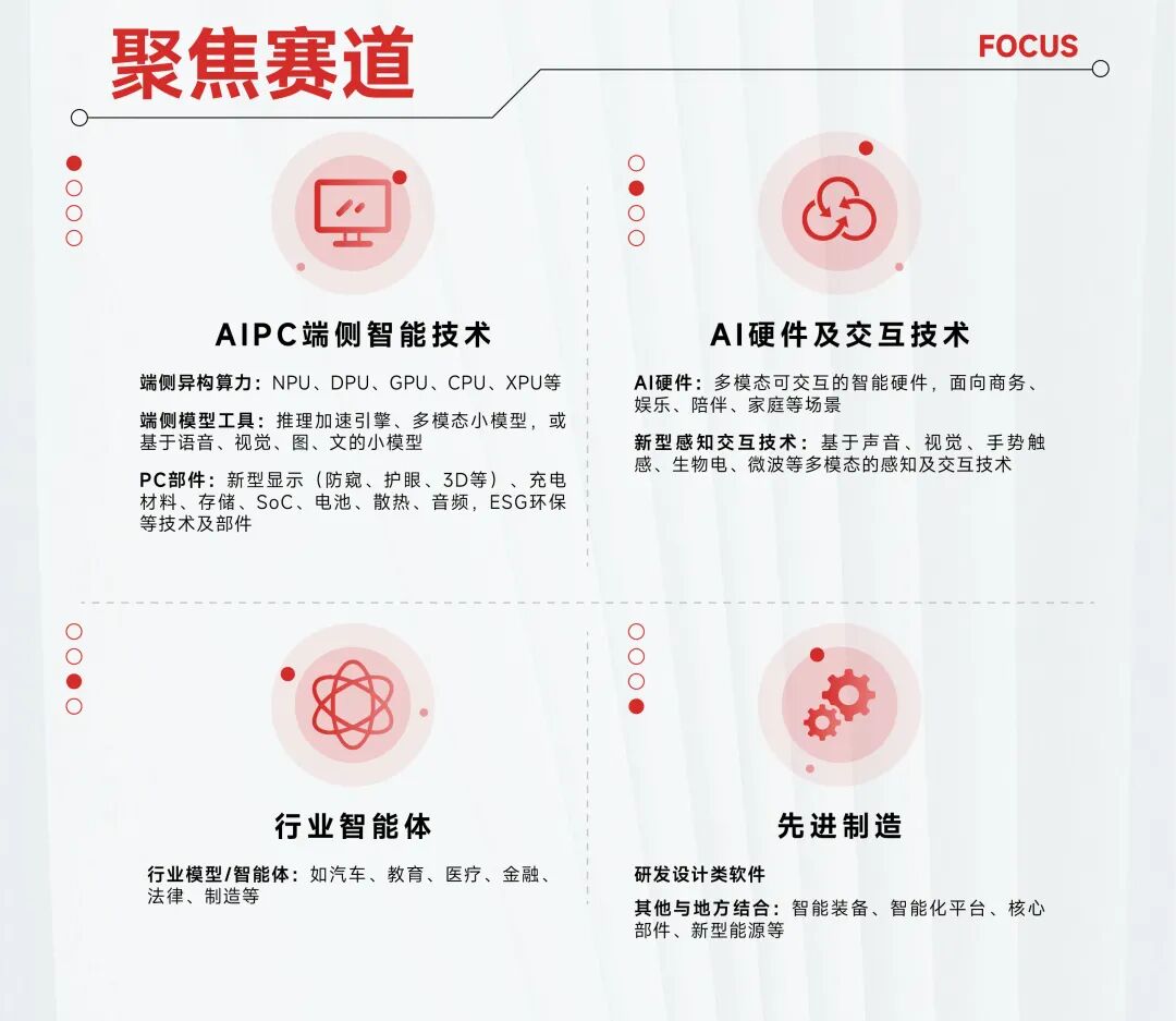 本次路演季面向AIPC端側(cè)智能技術(shù)、AI硬件及交互技術(shù)、行業(yè)智能體、先進(jìn)制造四大賽道進(jìn)行項目招募(詳見文末長圖)。