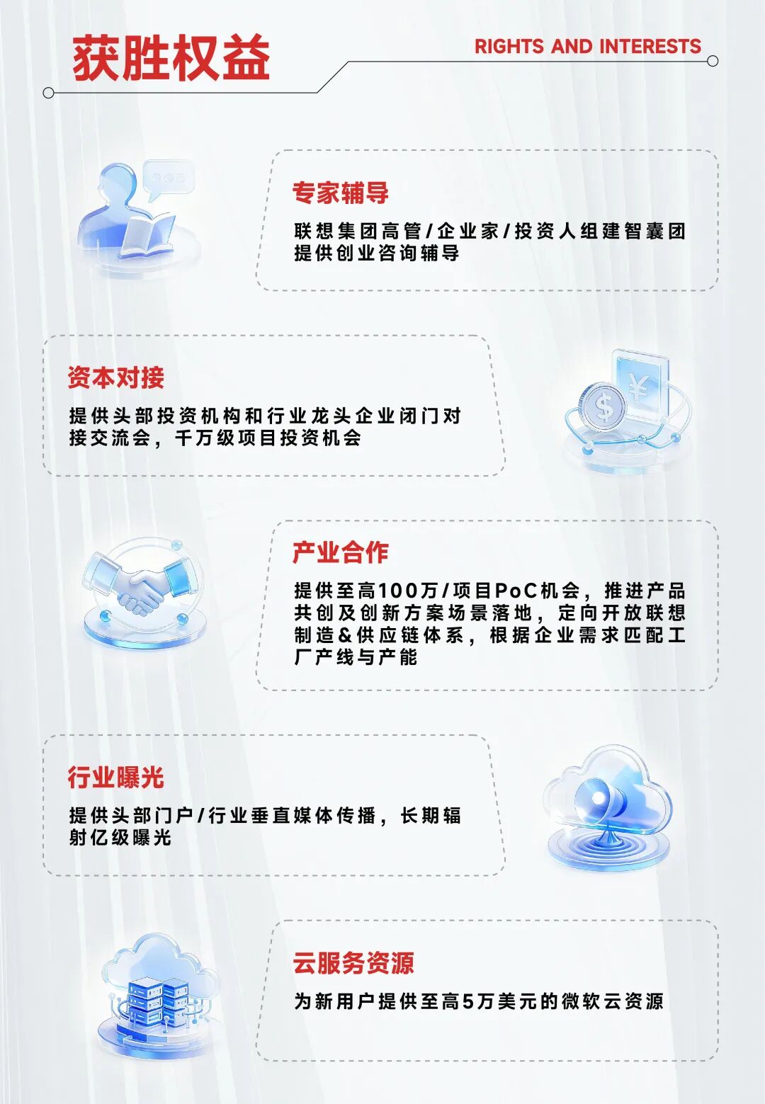 隨著聯(lián)想“中小企業(yè)生態(tài)朋友圈”的不斷擴(kuò)大,本季注入的賦能資源也得到了升級。所有參賽者均可解鎖產(chǎn)研共創(chuàng)、生態(tài)開放、資本扶持、品牌賦能和服務(wù)賦能五大核心權(quán)益。對于獲勝項目,聯(lián)想將提供專家團(tuán)咨詢輔導(dǎo)、百萬級PoC項目參與機(jī)會、聯(lián)想旗下工廠合作優(yōu)先權(quán)、頭部投資機(jī)構(gòu)閉門對接會和億級行業(yè)曝光。值得一提的是,聯(lián)想還將為本次獲勝項目額外提供至高5萬美元的微軟云資源。