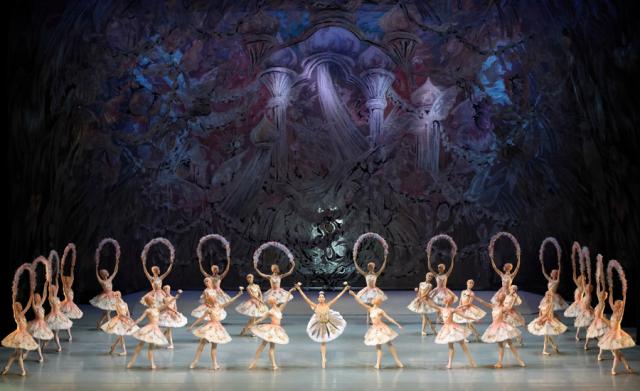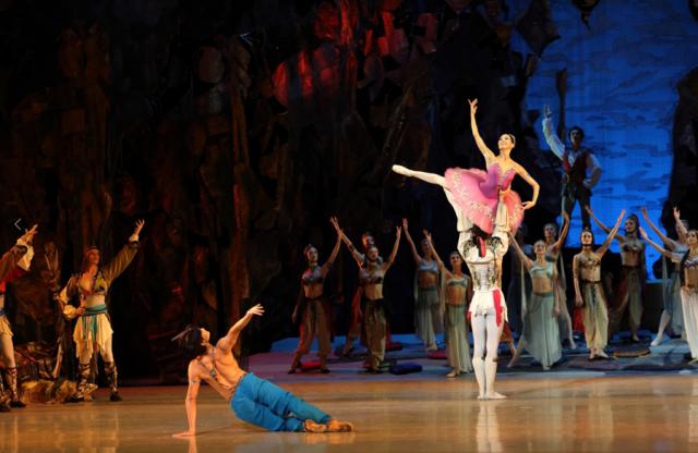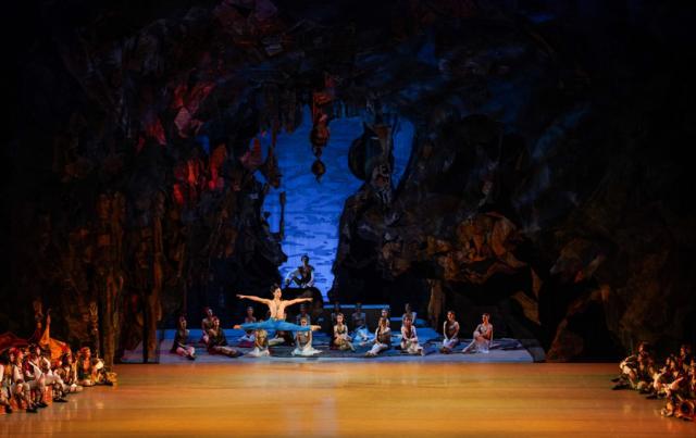 這是一個(gè)炫技的華彩舞段。米多拉面對康拉德被背叛、自己即將被出賣給蘇丹的困境,編舞用32個(gè)揮鞭轉(zhuǎn)的高難度技巧來表達(dá)女主角的果斷。捷廖什金娜在演繹這段時(shí),足尖技巧完美無瑕,她的速度和力度讓她的身體如同劈開舞臺的利劍,劇場里的時(shí)間仿佛因她而停滯。同時(shí),這個(gè)段落也給了男舞者足夠的發(fā)揮空間。金基珉扮演的阿里連續(xù)5圈旁腿轉(zhuǎn),起跳輕盈,空中姿態(tài)凌厲豪邁,他在社交網(wǎng)絡(luò)上獲得“飛人”的稱號名副其實(shí)。阿里起飛的瞬間,現(xiàn)場觀眾的情緒也隨之高漲。