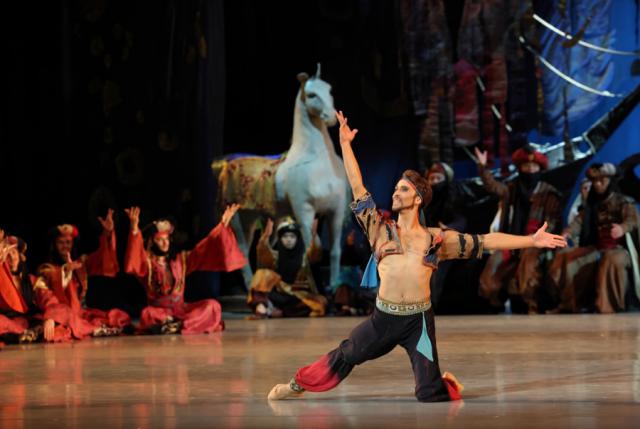 捷廖什金娜和金基珉引發(fā)轟動并不意外。在23日午后的劇場后臺,整個(gè)舞團(tuán)都在為“青春版”的亮相緊張而有序地準(zhǔn)備著。下午四點(diǎn),胖胖的舞美主任謝爾蓋帶著一群觀眾悄悄來到側(cè)幕,講解海盜船如何在臺上展現(xiàn)乘風(fēng)破浪的效果。他們小心地繞開舞臺,因?yàn)榇藭r(shí)基訓(xùn)老師正在給阿莉薩·巴里諾娃加班排練。一小時(shí)后,基訓(xùn)老師反復(fù)向年輕姑娘強(qiáng)調(diào)若干舞姿技術(shù)的要點(diǎn),才讓她離開。緊接著,又立刻召集年輕的群舞演員進(jìn)行一小時(shí)的基礎(chǔ)訓(xùn)練。謝爾蓋帶領(lǐng)觀眾參觀時(shí),經(jīng)過一匹和實(shí)物等大的道具馬,馬背上蓋著的織金花毯已經(jīng)有些磨損了,他伸出雙手愛惜地?fù)崦?,嘆息道:“這個(gè)版本已經(jīng)演了35年,許多東西看起來有些舊了,但是不要緊,到了臺上,燈光一照,一切都會是很美的?!彼倪@句話,道出了馬林斯基這艘“芭蕾航母”依舊驚人的原因:嚴(yán)謹(jǐn)對待技藝,珍重對待作品,所以大幕開啟,燈光下,“一切都是很美的”。