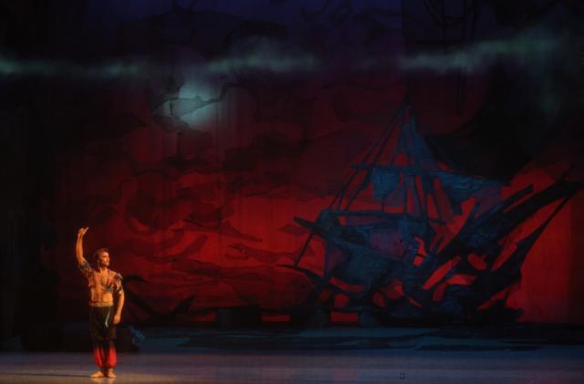 《海盜》自首次亮相就追求豪邁的舞臺奇觀,人物眾多,布景和服裝極盡華美,音樂、舞蹈和演出整體的色彩絢爛至極。馬林斯基的這個(gè)演出版本,通過投影、繪景和實(shí)景的結(jié)合,打造出美輪美奐的劇場視聽效果。大幕拉開,投屏畫面和繪制景片重疊的視覺效果,瞬間將觀眾帶到風(fēng)暴中的海面。實(shí)體的巨大海盜船在濃云和巨浪的畫片里穿行,借助燈光的魔力,現(xiàn)場看起來比好萊塢大片《加勒比海盜》的特效畫面還要驚人。道具海盜船尺寸巨大,船身比成人還高,船體上的帆和繩索細(xì)節(jié)完備,四位男女主角穩(wěn)坐在上面仍顯得很寬敞,舞團(tuán)希望借此還原海上生活的美好想象。