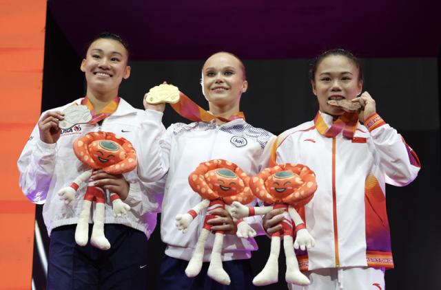 中立選手梅爾尼科娃、美國選手黃莉安(左)和張清穎分獲世錦賽女子個人全能冠亞季軍。
