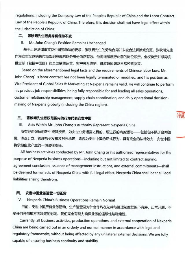 四、安世中國的業(yè)務(wù)運(yùn)營一切正常。目前,安世中國所有業(yè)務(wù)活動、生產(chǎn)運(yùn)營及對外合作均在法律與管理制度框架下有序、正常開展,不受任何外部單方面決定的影響。安世中國完全有能力確保業(yè)務(wù)的連續(xù)性與穩(wěn)定性。