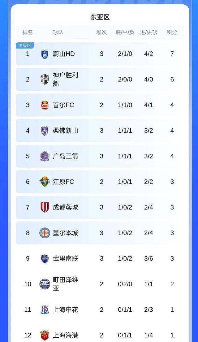蓉城、海港爆冷失利,亞冠積分榜更新,海港申花排名倒數(shù)前二