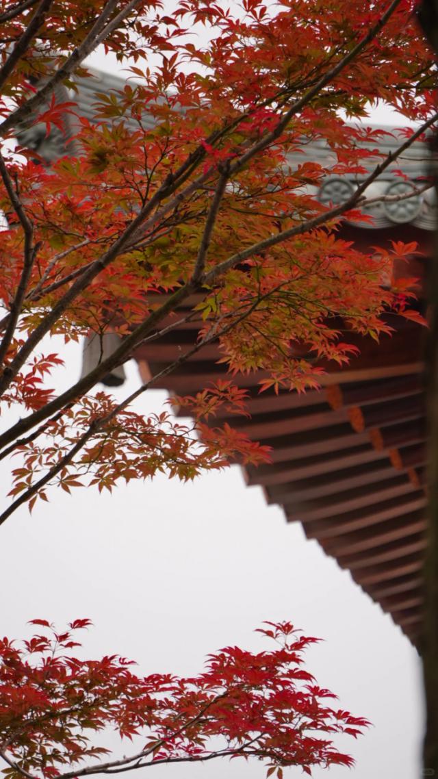 寺內(nèi)的木構(gòu)連廊蜿蜒曲折,赭紅色的木質(zhì)回廊與火紅的楓葉相得益彰。走在回廊中,透過精致的木窗格,楓葉與廊柱構(gòu)成獨(dú)特的框架式構(gòu)圖,充滿詩意。