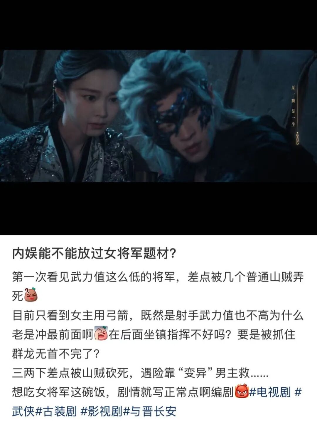 今年多部女將軍題材古裝劇,都拍成了戀愛腦劇本。女主上陣殺敵只出現(xiàn)在前三集,之后就是“將軍撒嬌、男主吃醋、副將起哄”的循環(huán),觀眾自然難以下咽。