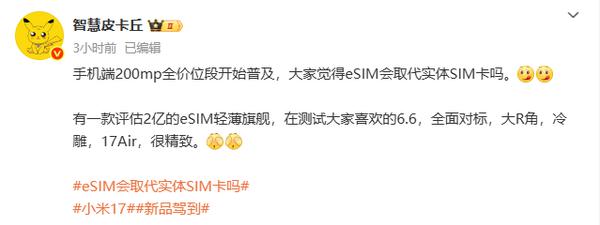 爆料:小米17 Air正在籌備,或有超薄機(jī)身、2億像素與eSIM技術(shù)