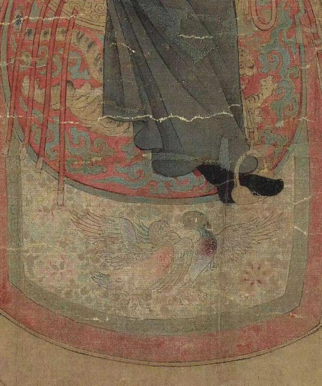 他衣服上有精細(xì)的描金鸞鳳團(tuán)花紋飾。