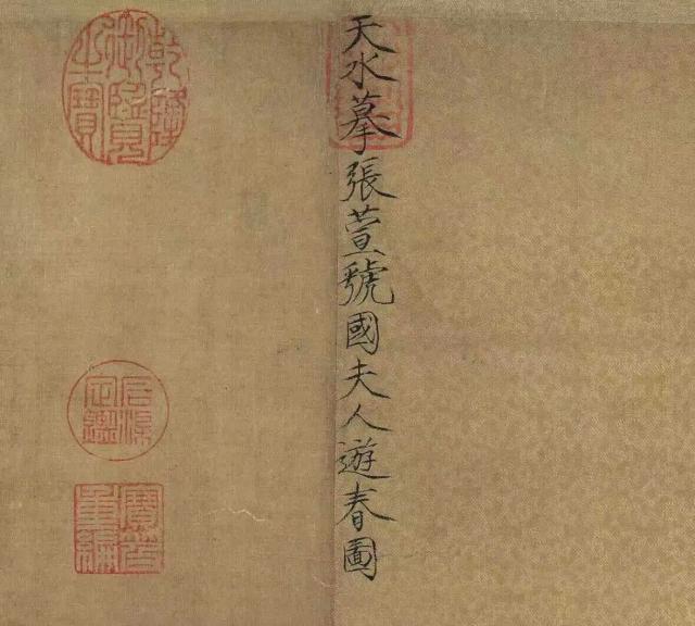 除了看畫,別忘了看畫上的字。卷首有仿宋徽宗瘦金體的題簽“天水摹張萱虢國夫人游春圖”。