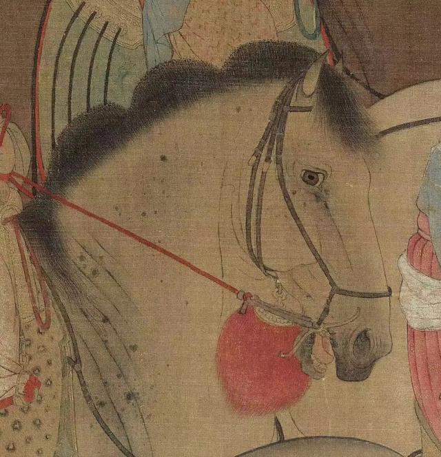 這匹馬打扮也獨(dú)特,馬鞍下的鞍韉是紅底白虎,有力量感,障泥紋樣是鴛鴦,很柔美。
