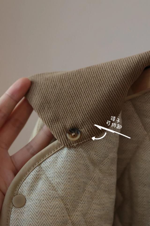 從領(lǐng)圈、門襟到下擺,甚至袖口都做了收邊處理,讓外套更立體有型,也更精致好看。