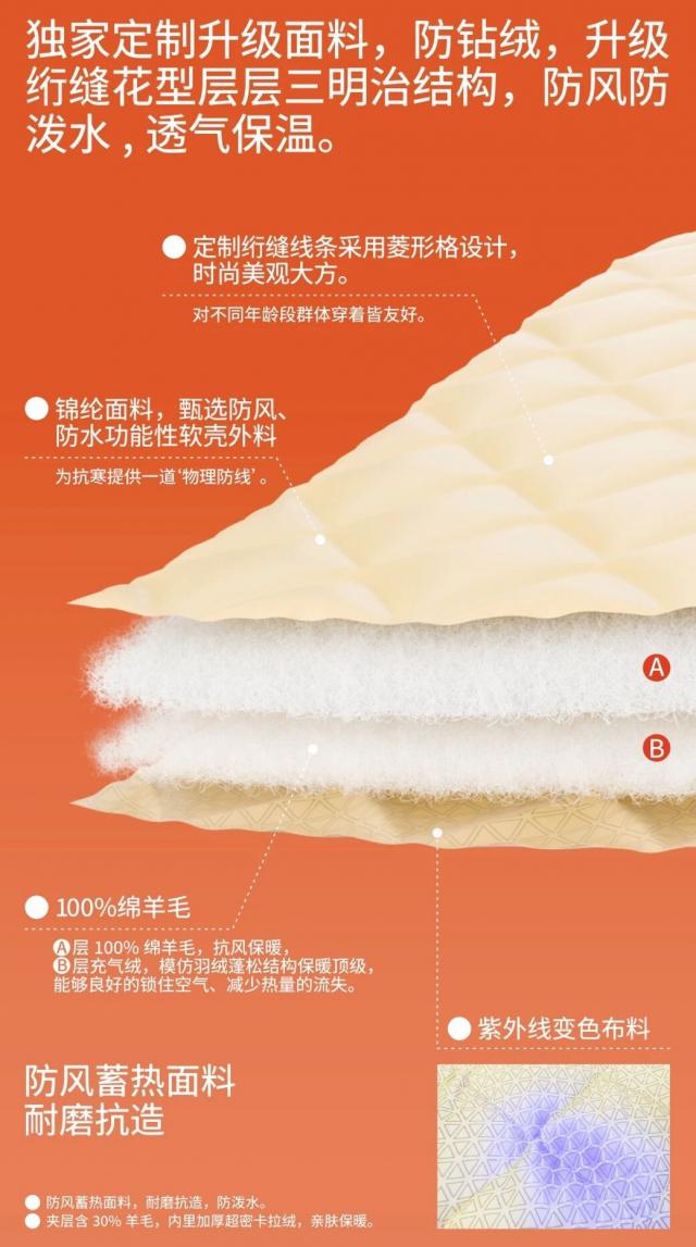 它一共有三層,還特別做了【鎖溫防鉆絨】設(shè)計(jì):