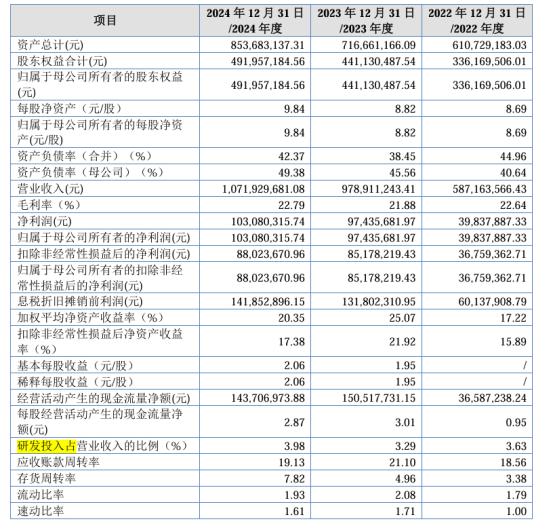 2022 - 2024年期間,其營業(yè)收入從5.87億元增長到10.72億元,凈利潤也從3983.79萬元提升至1.03億元,年復合增長率分別達到22.2%、37.3%,這樣迅猛的增長勢頭讓市場對其未來發(fā)展充滿期待。