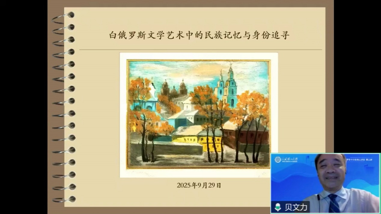 第三場講座,華東師范大學(xué)白俄羅斯研究中心主任貝文力作了《白俄羅斯文學(xué)藝術(shù)中的民族記憶與身份追尋》的報告。他以歷史為線索,梳理白俄羅斯文學(xué)與藝術(shù)的發(fā)展脈絡(luò),通過賞析建筑、繪畫、雕塑、紀(jì)念建筑群等藝術(shù)符號,介紹民族生活與斗爭傳統(tǒng),讓師生們感受到真實立體的白俄羅斯,理解當(dāng)?shù)厝嗣駥τ洃浀氖刈o(hù)和身份的追尋。
