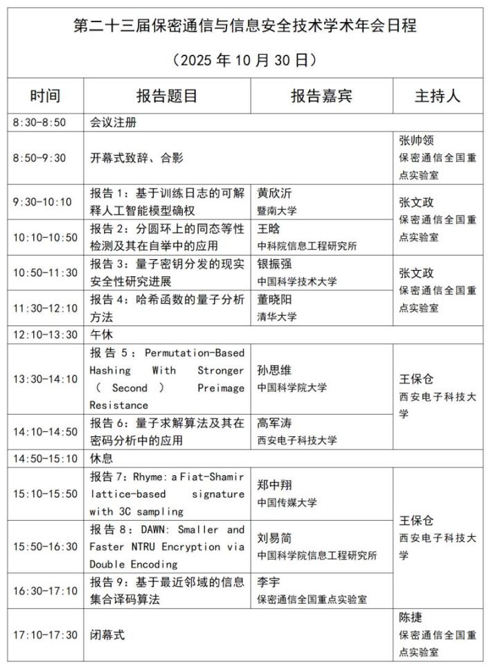 第二十三屆保密通信與信息安全技術(shù)學(xué)術(shù)年會(huì)定于2025年10月30日在陜西省西安市舉辦。本次會(huì)議由四川省電子學(xué)會(huì)、保密通信全國(guó)重點(diǎn)實(shí)驗(yàn)室主辦,西安電子科技大學(xué)通信工程學(xué)院承辦。