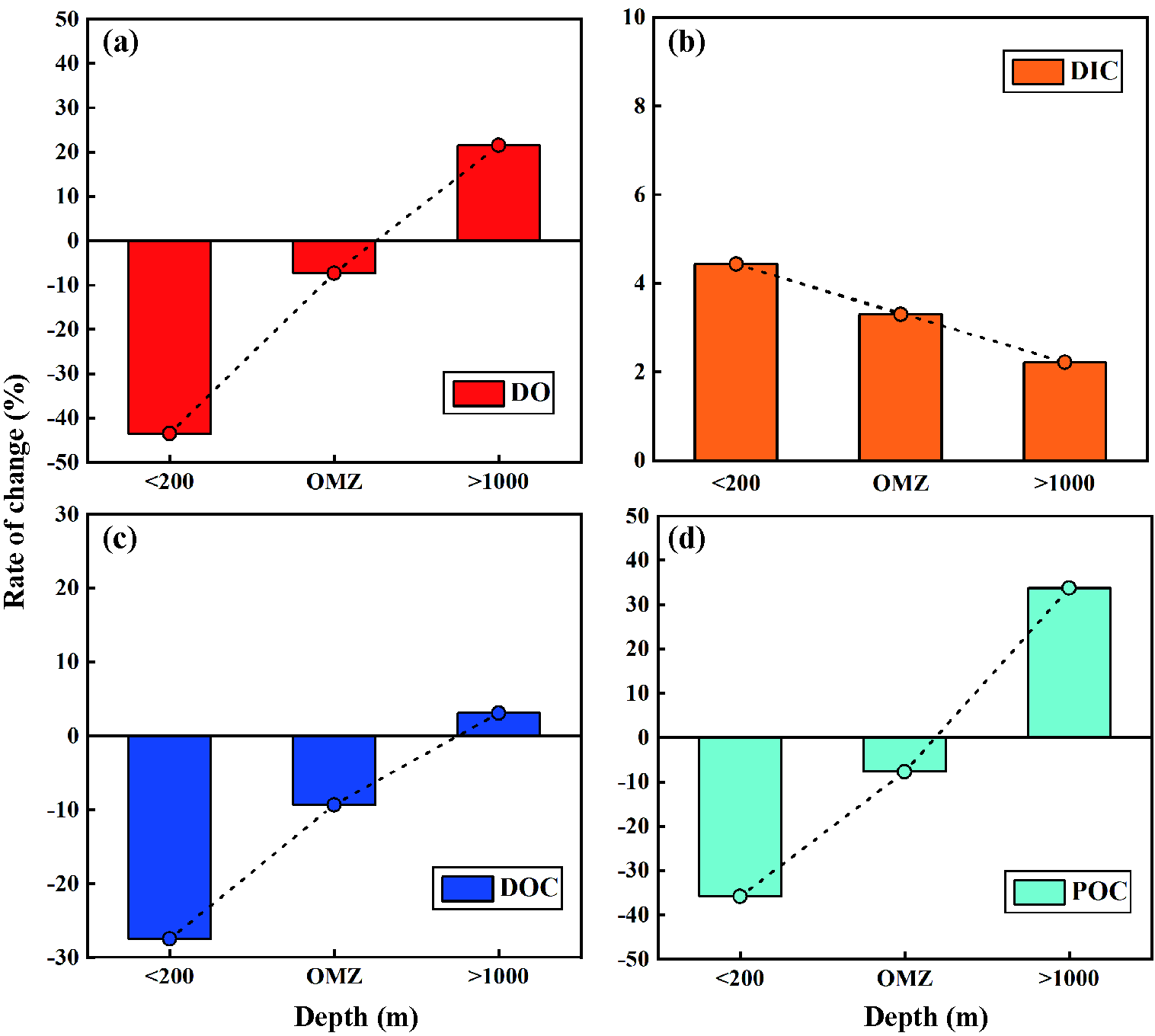 研究的關(guān)鍵發(fā)現(xiàn)是,DO在有機(jī)碳向無(wú)機(jī)碳的轉(zhuǎn)化過(guò)程中起決定性作用。OMZ內(nèi)部DOC和POC的減少速率明顯低于OMZ上方的水層,這表明OMZ內(nèi)部的有機(jī)質(zhì)降解速率遠(yuǎn)低于OMZ上方水體,OMZ加強(qiáng)了有機(jī)質(zhì)向下層水的輸送,可顯著增強(qiáng)深海的碳匯強(qiáng)度。由此可見(jiàn),大洋OMZ對(duì)深海碳匯的形成意義非凡。