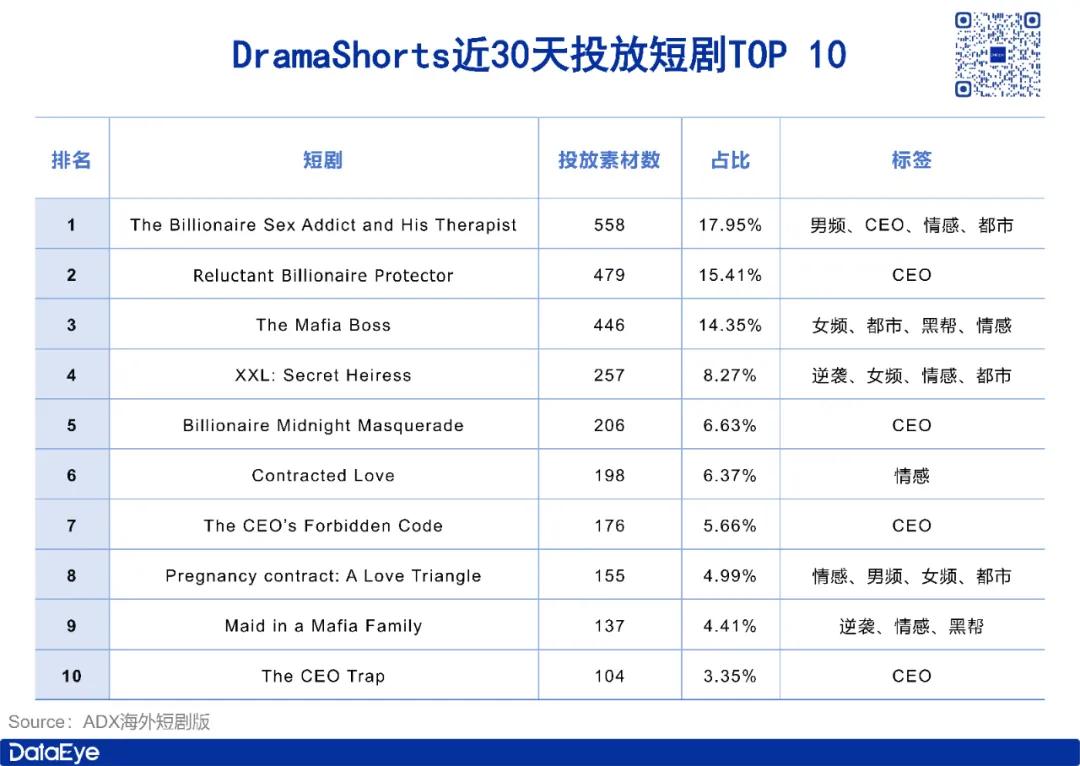 基于此,DataEye研究院整理了DramaShorts近30天投放短劇TOP 10,如下: