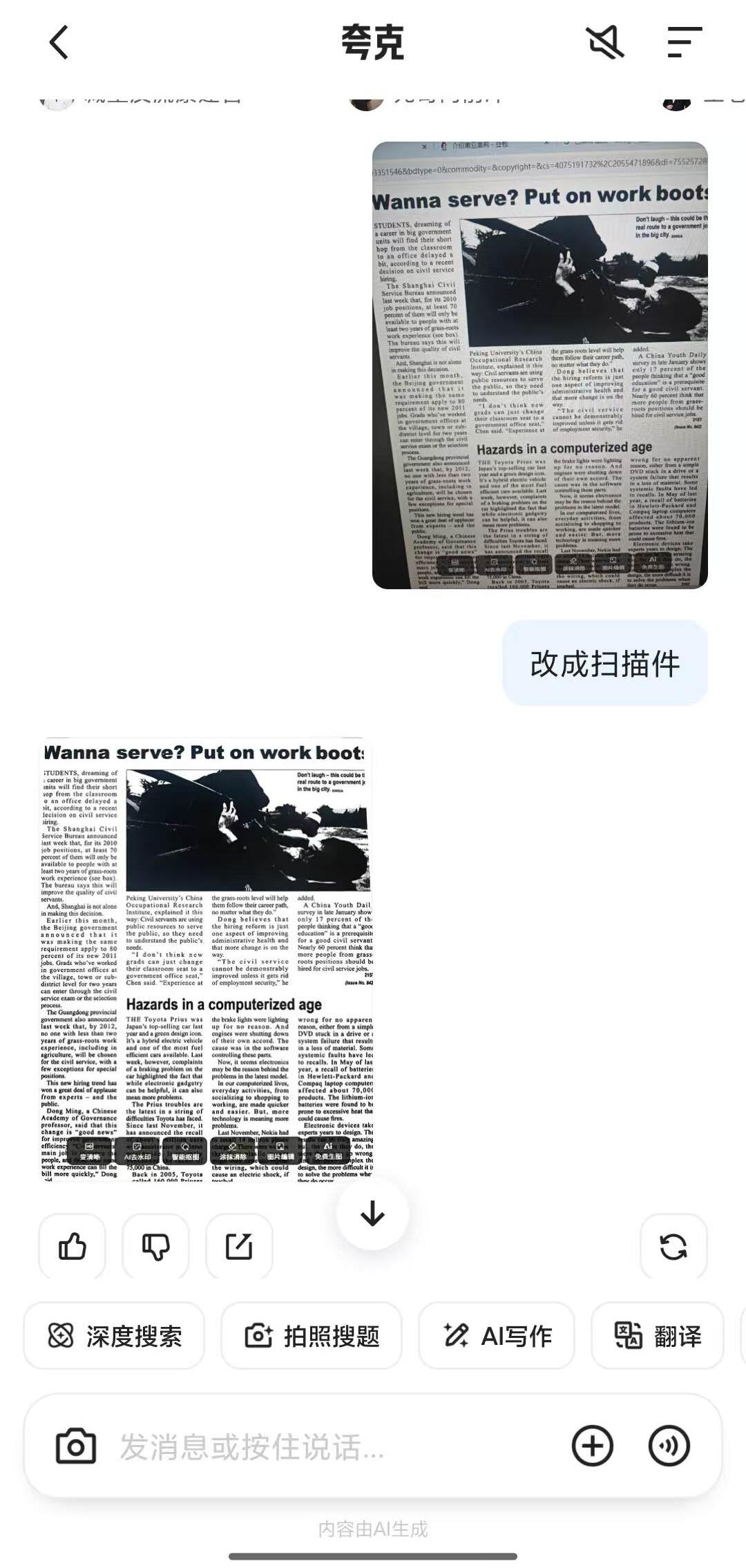 除傳統(tǒng)對話,夸克對話助手繼承了夸克APP的辦公功能優(yōu)勢,比如可直接將圖片變成掃描件:
