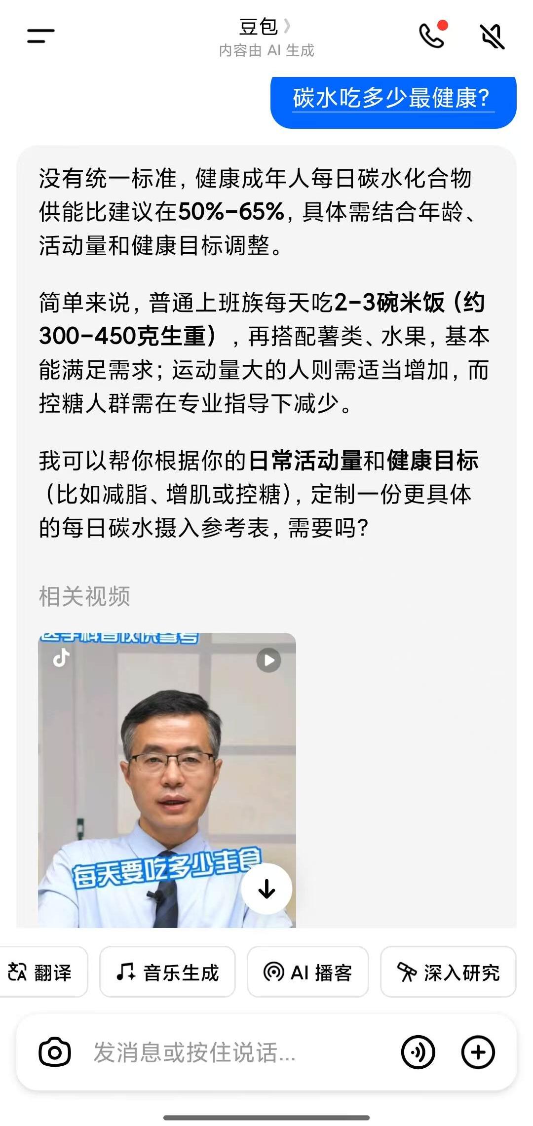 對話框上方快捷功能對比更明顯,夸克對話助手下方快捷功能有深度搜索、拍照搜題、AI寫作翻譯、文檔閱讀、打電話;豆包則加入更多娛樂化功能,如豆包P圖、照片動(dòng)起來、來點(diǎn)音樂。
