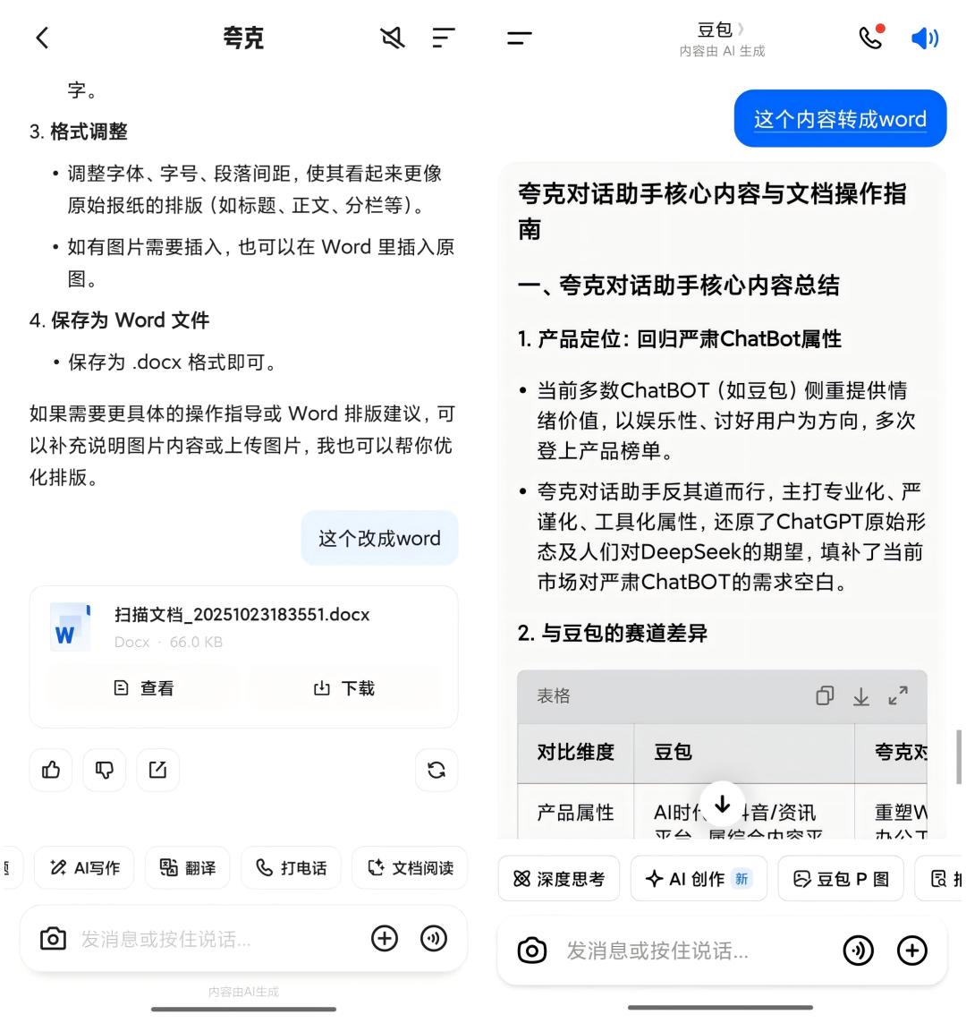 夸克對話助手在格式轉(zhuǎn)化方面也很強(qiáng),對話內(nèi)容可隨時(shí)轉(zhuǎn)成Word文檔,而豆包似乎沒理解同樣的問題。