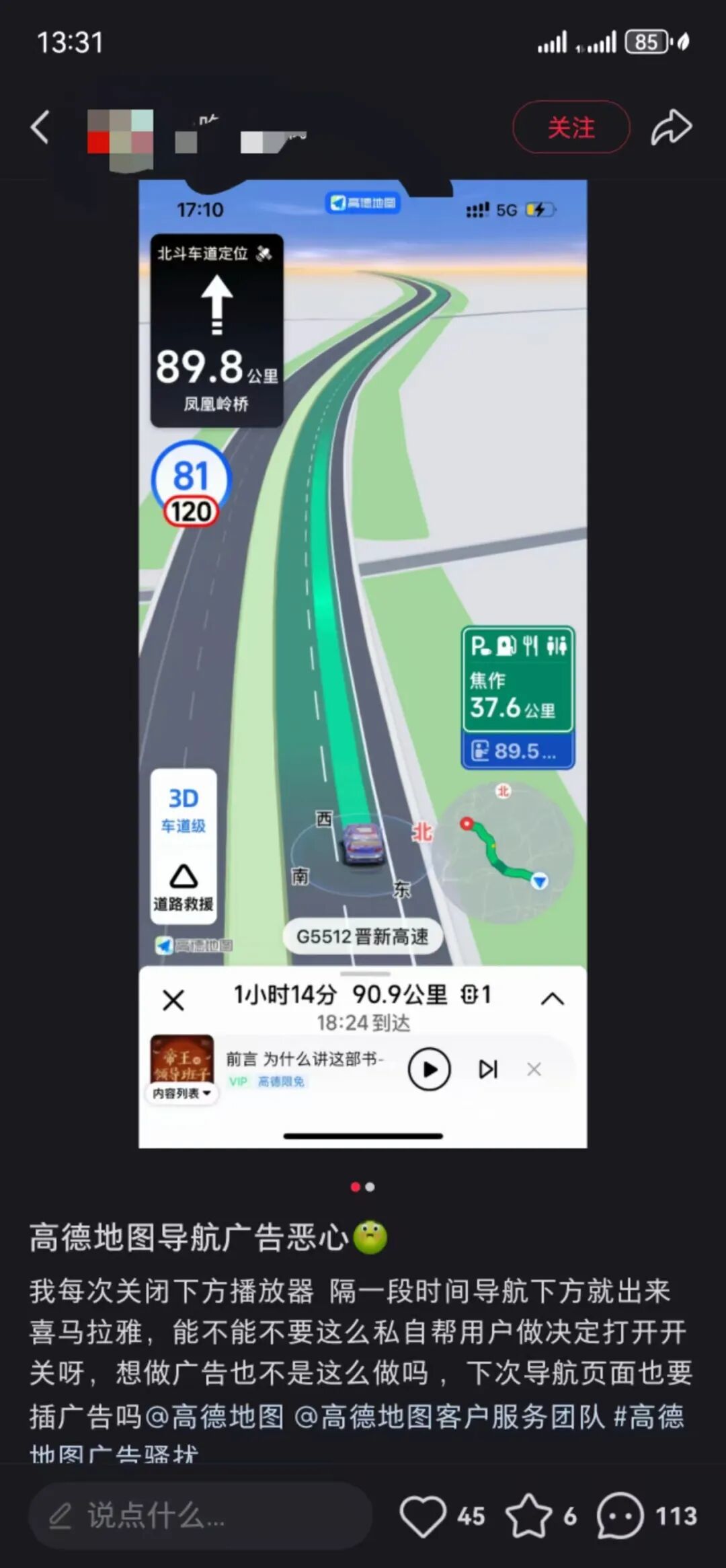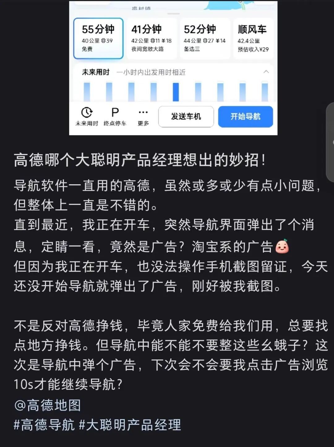 也有網(wǎng)友提到語音導(dǎo)航第一句插播廣告的問題,稱使用高德時語音導(dǎo)航第一句就是廣告,感覺很突兀。