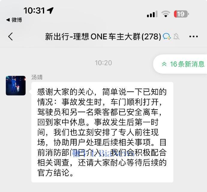 今早,理想汽車第一產(chǎn)品線總裁湯靖也在車主群內(nèi)進行回應(yīng),確認人員安全,并表示將會積極配合相關(guān)調(diào)查,請大家等待官方結(jié)論。