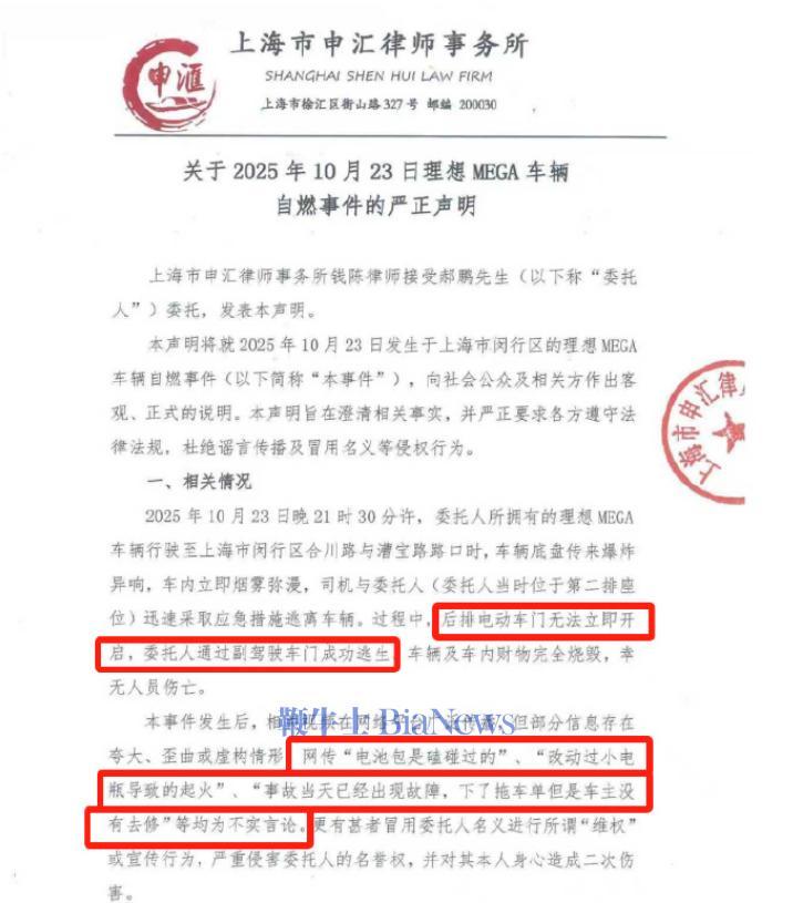 針對昨晚一輛理想Mega在行駛途中突然起火這一事件,當事人委托律師嚴正聲明: