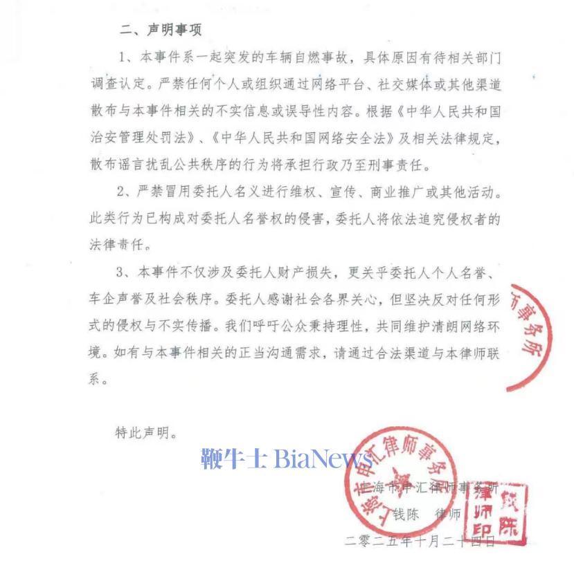 聲明稱,本事件是一起突發(fā)的車輛自燃事故,具體原因有待相關(guān)部門調(diào)查認定。嚴禁任何個人或組織通過網(wǎng)絡(luò)平臺、社交媒體或其他渠道散布與本事件相關(guān)的不實信息或誤導(dǎo)性內(nèi)容。