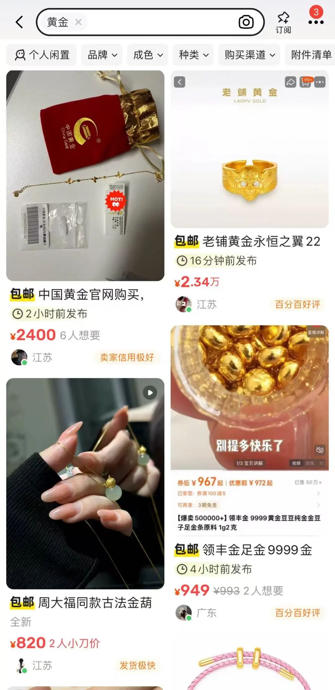 黃金消費的熱度不僅體現(xiàn)在品牌官方店鋪,二手交易平臺也很活躍。記者在閑魚平臺搜索“黃金”,發(fā)現(xiàn)已有用戶掛出黃金飾品轉(zhuǎn)賣信息,聲稱“搶到后可直接修改收貨地址”,無需等待實物轉(zhuǎn)寄。