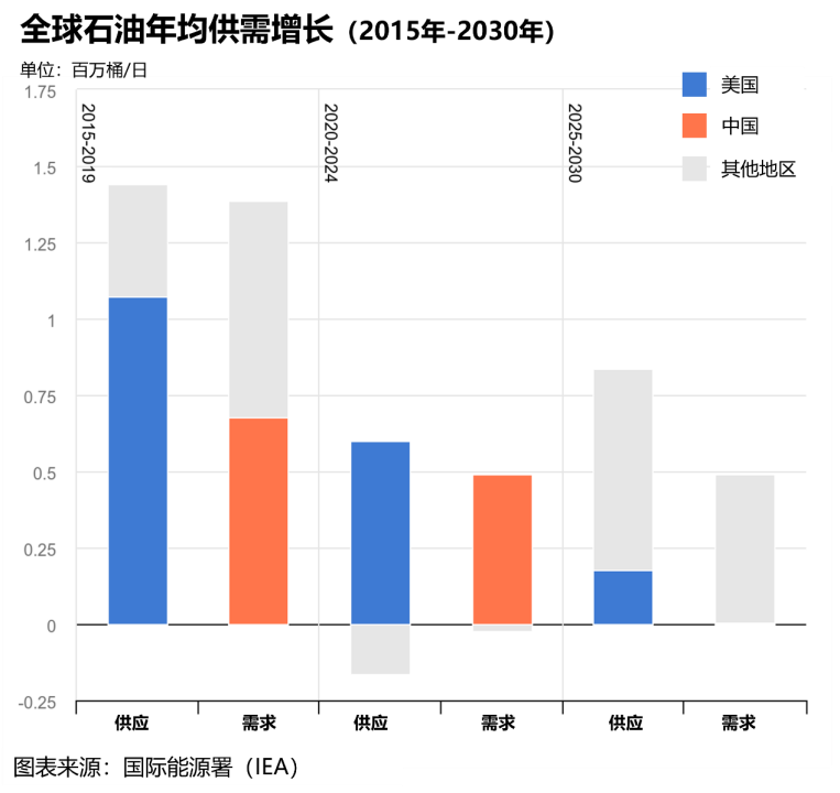 過去十年,國(guó)際油市格局由“美國(guó)供給增長(zhǎng)”與“中國(guó)需求增長(zhǎng)”塑造。2015 - 2024年,美國(guó)因頁(yè)巖油革命貢獻(xiàn)全球原油供應(yīng)增量約90%;中國(guó)石油需求增長(zhǎng)近600萬(wàn)桶/日,占全球需求增量六成。